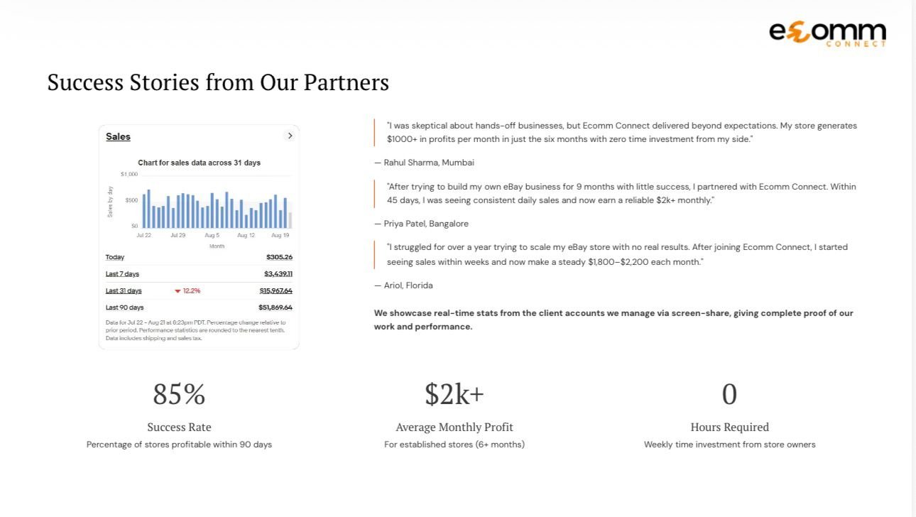 “Our mission is simple,” says the leadership team at Ecomm Connect. “We build profitable, automated online stores that deliver real, measurable results — without burdening our partners with the logistics, marketing, or management.”