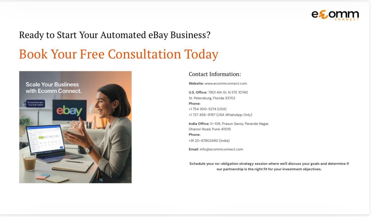 Ecomm Connect, a business automation agency founded in 2016 with headquarters in St. Petersburg, Florida, and a key operations hub in Pune, Maharashtra, offers a 100% Done-For-You ecommerce service across major online marketplaces including Amazon, eBay, Walmart, Etsy, and more.